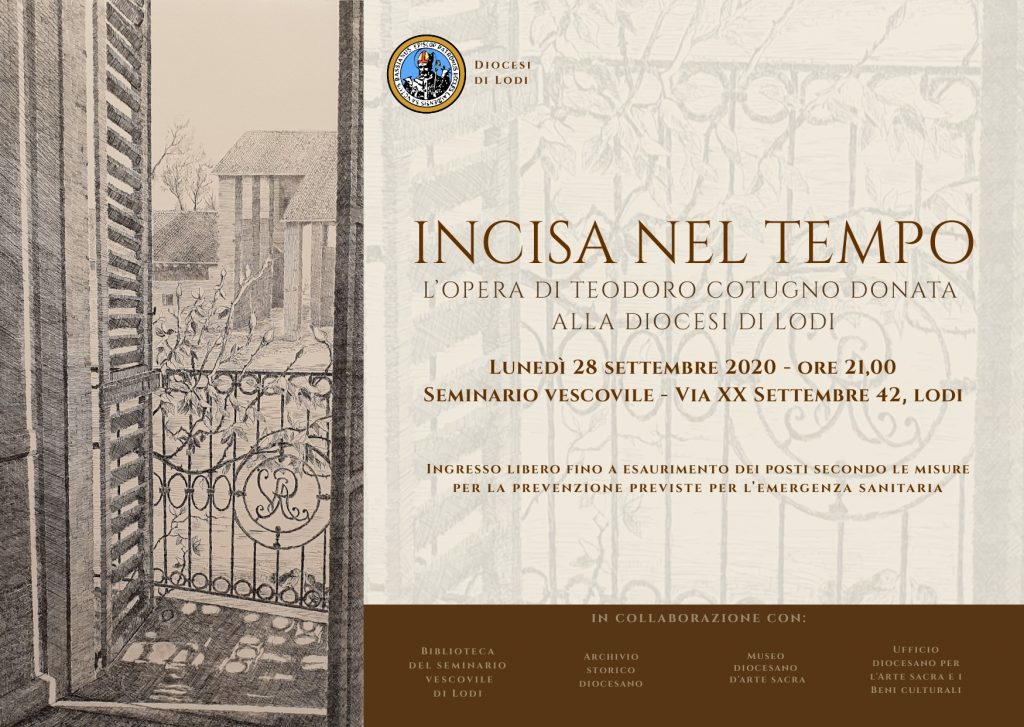 Lunedì 28 settembre alle ore 21 presso i locali del Seminario vescovile di Lodi (in via XX Settembre, n. 42) sarà presentato il risultato della catalogazione delle incisioni donate da Teodoro Cotugno alla Diocesi di Lodi. Sarà presente l’Autore che dialogherà della propria esperienza artistica con don Luca Anelli, direttore del Museo diocesano d’Arte sacra. Il pubblico potrà inoltre visionare in loco alcune opere dell’artista in esposizione.
