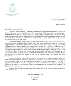 Lodi, 11 maggio 2019 A tutti i Parroci Reverendi e cari confratelli, la Veglia di Pentecoste in Cattedrale costituisce ogni anno un appuntamento ecclesiale di rilievo, al quale invito cordialmente i laici provenienti dalle parrocchie, in particolare i rappresentanti parrocchiali giovani e adulti, e come sempre i membri delle associazioni e dei movimenti presenti in […]