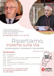 Sabato 28 maggio, dalle 9.00 alle 12.30, si svolgerà il Convegno delle Caritas Parrocchiali e dei Volontari, dal titolo: Ripartiamo, insieme sulla via