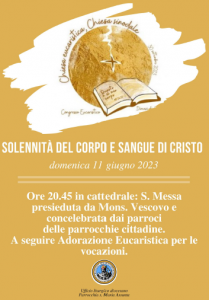 Celebrare il Corpus Domini significa rendere grazie, ogni volta, alla “medicina” che, per i cristiani, allevia questa sete: domenica prossima, 11 giugno, il vescovo presiederà la cerimonia solenne in Cattedrale, alle ore 20.45 (concelebrata dai parroci delle parrocchie cittadine, a seguire l’Adorazione Eucaristica per le vocazioni).