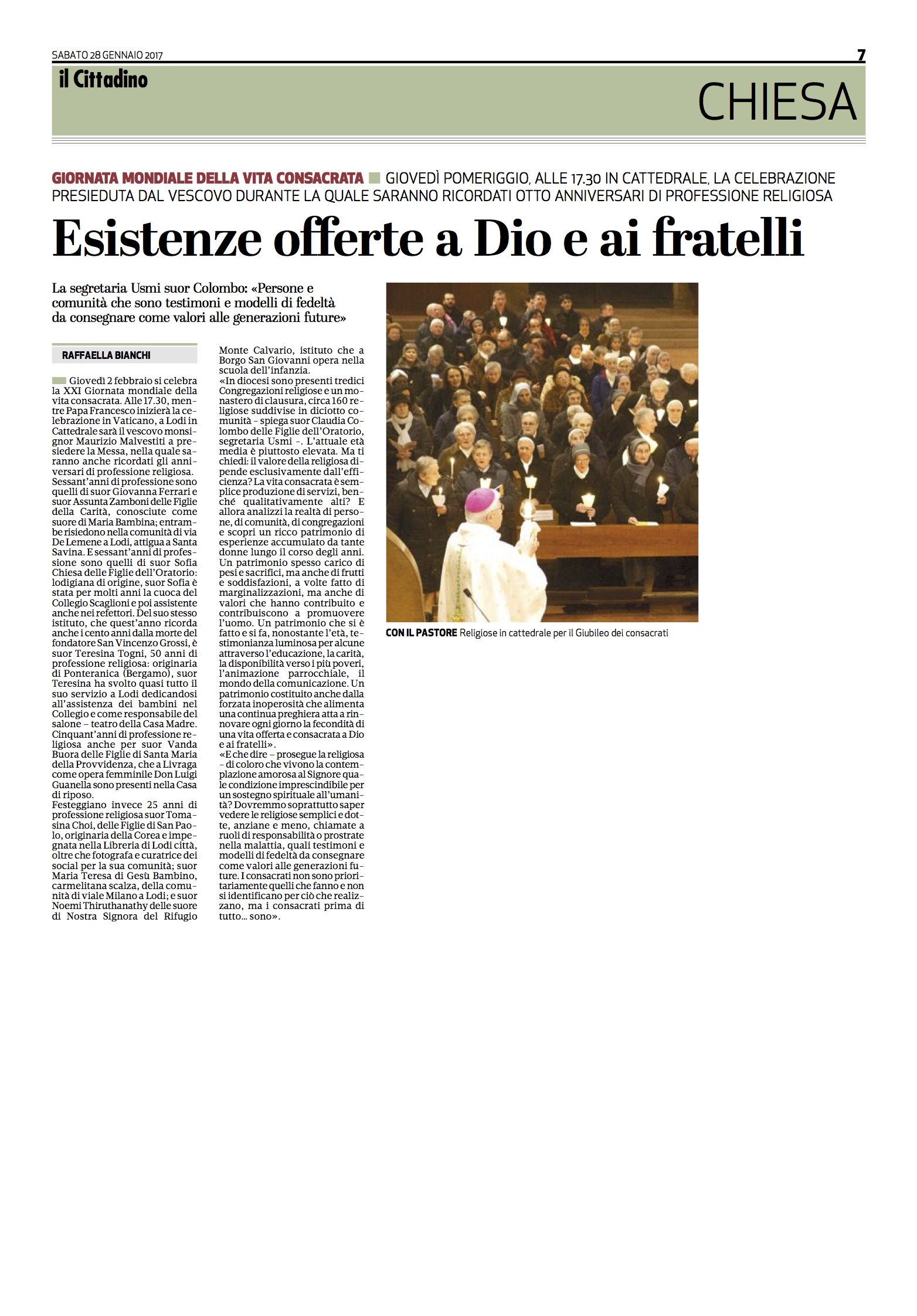 A seguire un articolo apparso sabato 28 gennaio 2017 su Il Cittadino di Lodiin cui la Segretaria dell’USMI diocesana, sr. Claudia Colombo, illustra il significato della XXI Giornata Mondiale della Vita Consacrata e presenta le Religiose che saranno festeggiate in Duomo.
