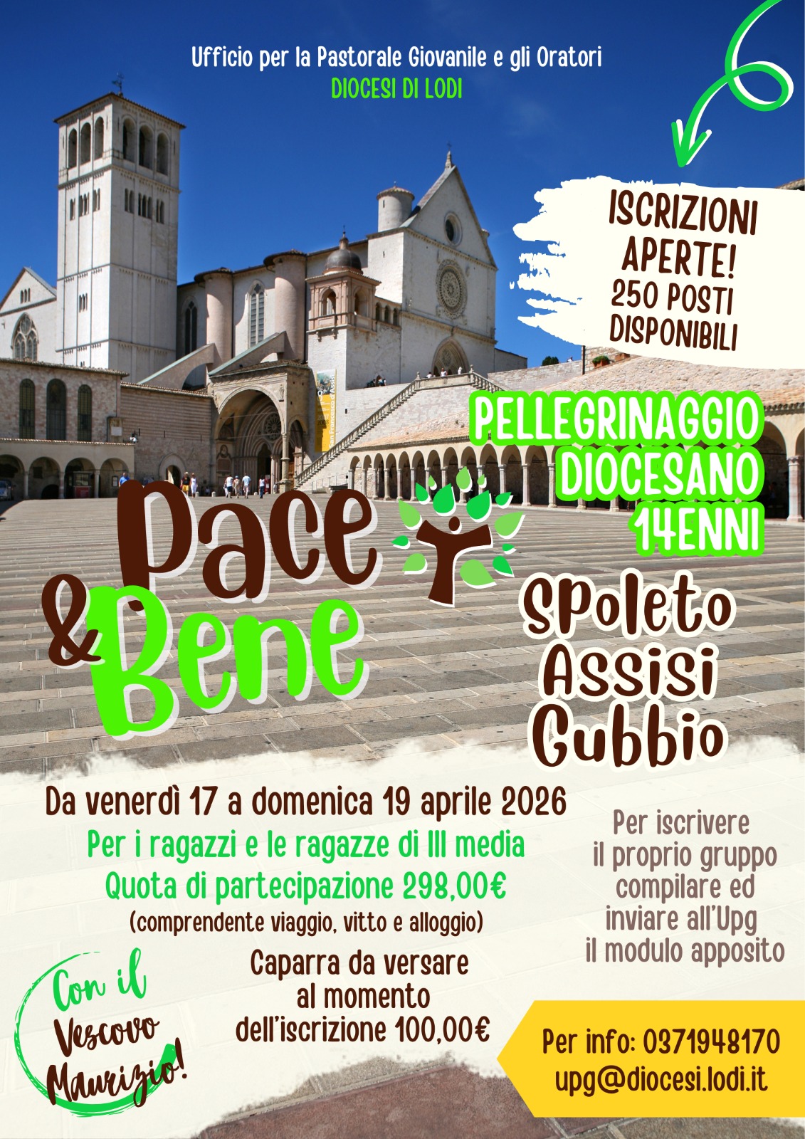 Sono aperte le iscrizioni al pellegrinaggio diocesano per i ragazzi di III media, da venerdì 17 a domenica 19 aprile prossimi: tre giorni per gustare i luoghi e le tappe fondamentali della vita di san Francesco. Quest’anno, oltre ad Assisi, visiteremo le cittadine di Spoleto e Gubbio, in cui Francesco è passato e in cui sono ricordati episodi significativi della sua storia. Il pellegrinaggio 14enni è un’esperienza particolarmente bella per i nostri ragazzi: è un’occasione per incontrare Francesco ed ascoltare ciò che ha da dire alle loro vite e per vivere un momento di Chiesa di più ampio respiro rispetto a quello a cui sono abituati. In questi contesti si accorgono che ci sono tanti altri ragazzi che come loro vivono un cammino di fede, in tutta la sua bellezza e fatiche. Ci accompagnerà in questa esperienza anche il vescovo Maurizio, nostro pastore.