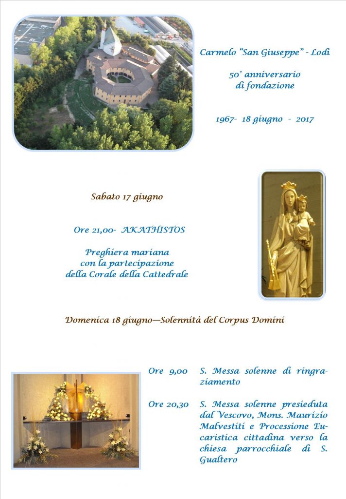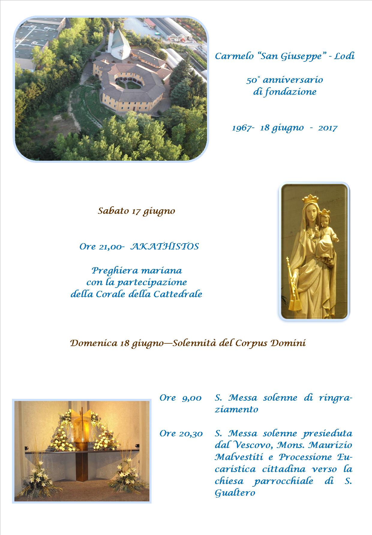 9 Giugno 201716 Giugno 2017I 50 anni dalla fondazione del Carmelo “San Giuseppe” Tutta la Diocesi si unisce con gioia ai festeggiamenti della Comunità Religiosa delle Monache Carmelitane, residente nel Carmelo “San Giuseppe” di Lodi, secondo il seguente Programma: condividi su