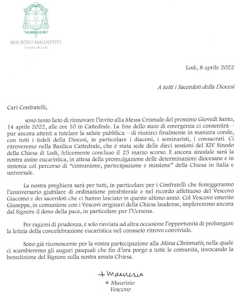 Pubblichiamo la lettera di S.E. Mons. Maurizio Malvestiti in occasione della S. Messa Crismale celebrata con i sacerdoti della diocesi in cattedrale a Lodi giovedì 14 aprile 2022 e anche la mozione introduttiva e l’omelia.