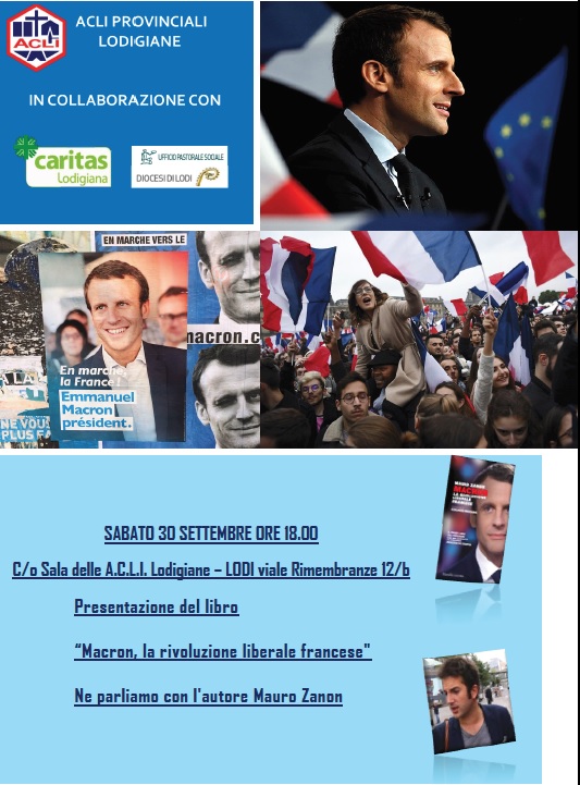 14 Settembre 201727 Settembre 2017“Macron, la rivoluzione liberale francese” Sabato 30 Settembre, ore 18.00: presso la Sala delle A.C.L.I. Lodigiane, a Lodi in viale delle Rimembranze 12/b, si terrà la presentazione del libro “Macron, la rivoluzione liberale francese”. Se ne parlerà con l’autore Mauro Zanon condividi su