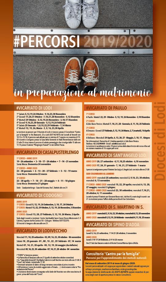 L’Ufficio per la famiglia della diocesi di Lodi ha predisposto il calendario degli incontri per il percorso in preparazione al matrimonio suggerito per le coppie di fidanzati che intendono celebrare il Sacramento del Matrimonio nell’Anno Pastorale 2019/20.