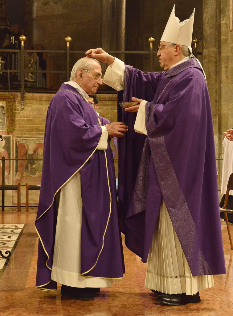 Il Vescovo impone le ceneri al Presidente del Capitolo dei Canonici, Mons. Bernazzani