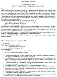 La scheda, a cura di un gruppo di lavoro del Consiglio Pastorale Diocesano, viene proposta come traccia per i Consigli Pastorali Parrocchiali (CPP), all’inizio del nuovo quinquennio di servizio, con la ripresa degli assi portanti del Sussidio e del Direttorio diocesano, in dialogo con la Evangelii gaudium, secondo l’invito di Papa Francesco nel discorso al Convegno Ecclesiale Nazionale di Firenze del 2015 (“permettetemi di lasciarvi un’indicazione per i prossimi anni: in ogni comunità, in ogni parrocchia […] cercate di avviare, in modo sinodale, un approfondimento della Evangelii gaudium, per trarre da essa criteri pratici e per attuare le sue disposizioni”).