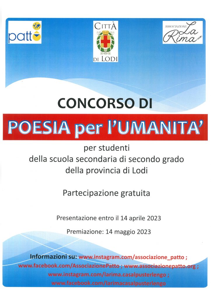 11– Il risultato sarà comunicato direttamente ai premiati e inoltre segnalato tramite pubblicazione sulle nostre pagine social: associazione_patto (Facebook / Instagram) e la rima casalpusterlengo (Facebook), larima.casalpusterlengo (Instagram).