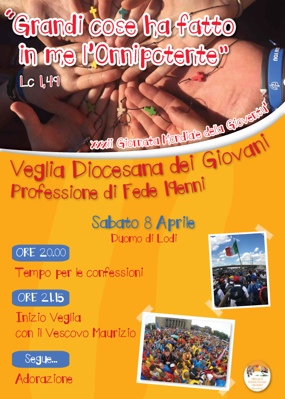 La Veglia dei Giovani è proposta dalla Diocesi la sera di sabato 8 aprile, per aiutare i giovani a vivere con consapevolezza e gioia la Giornata delle Palme (domenica 9 aprile 2017) che è anche la XXXII Giornata Mondiale della Gioventù (cf sito UPG).