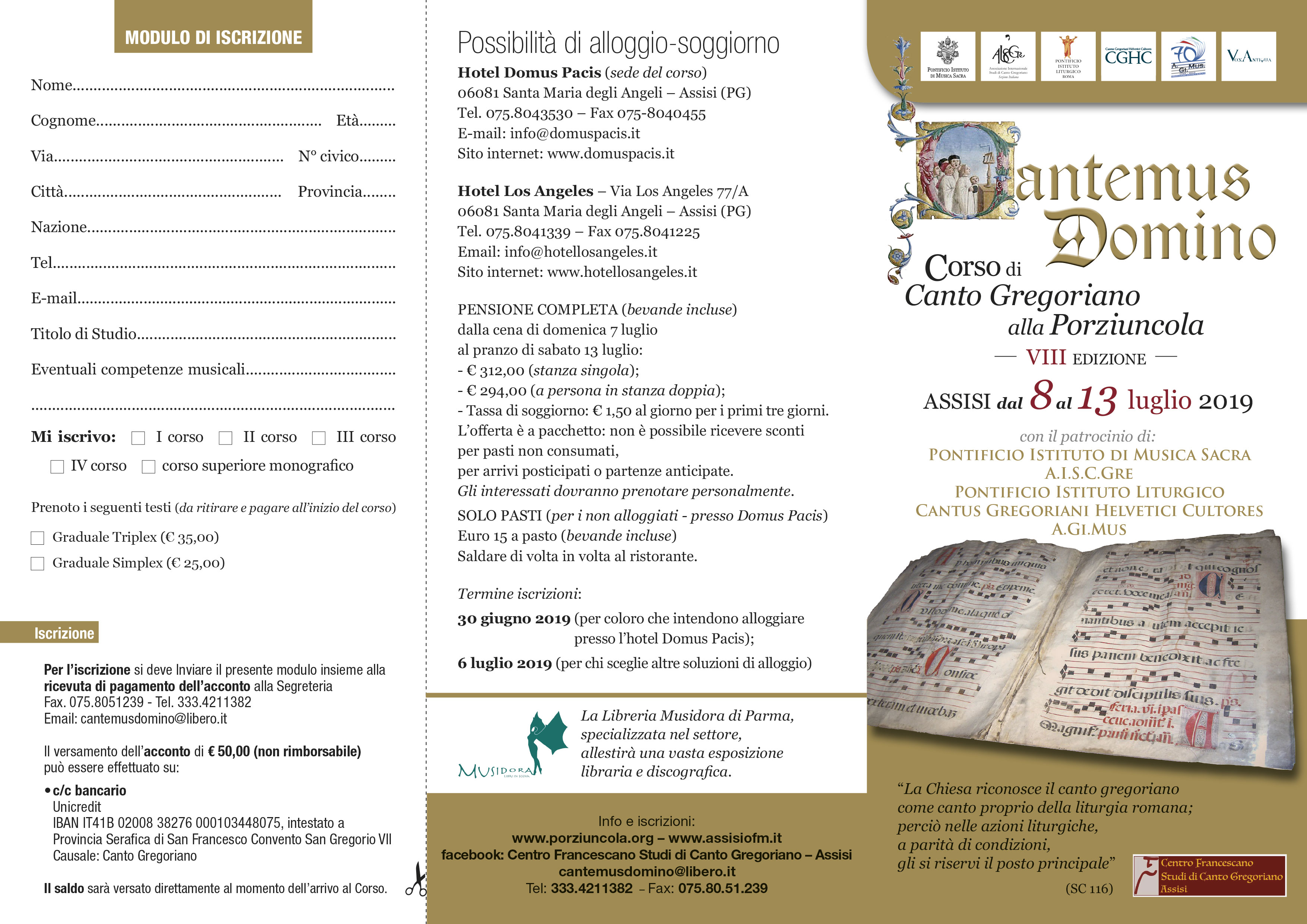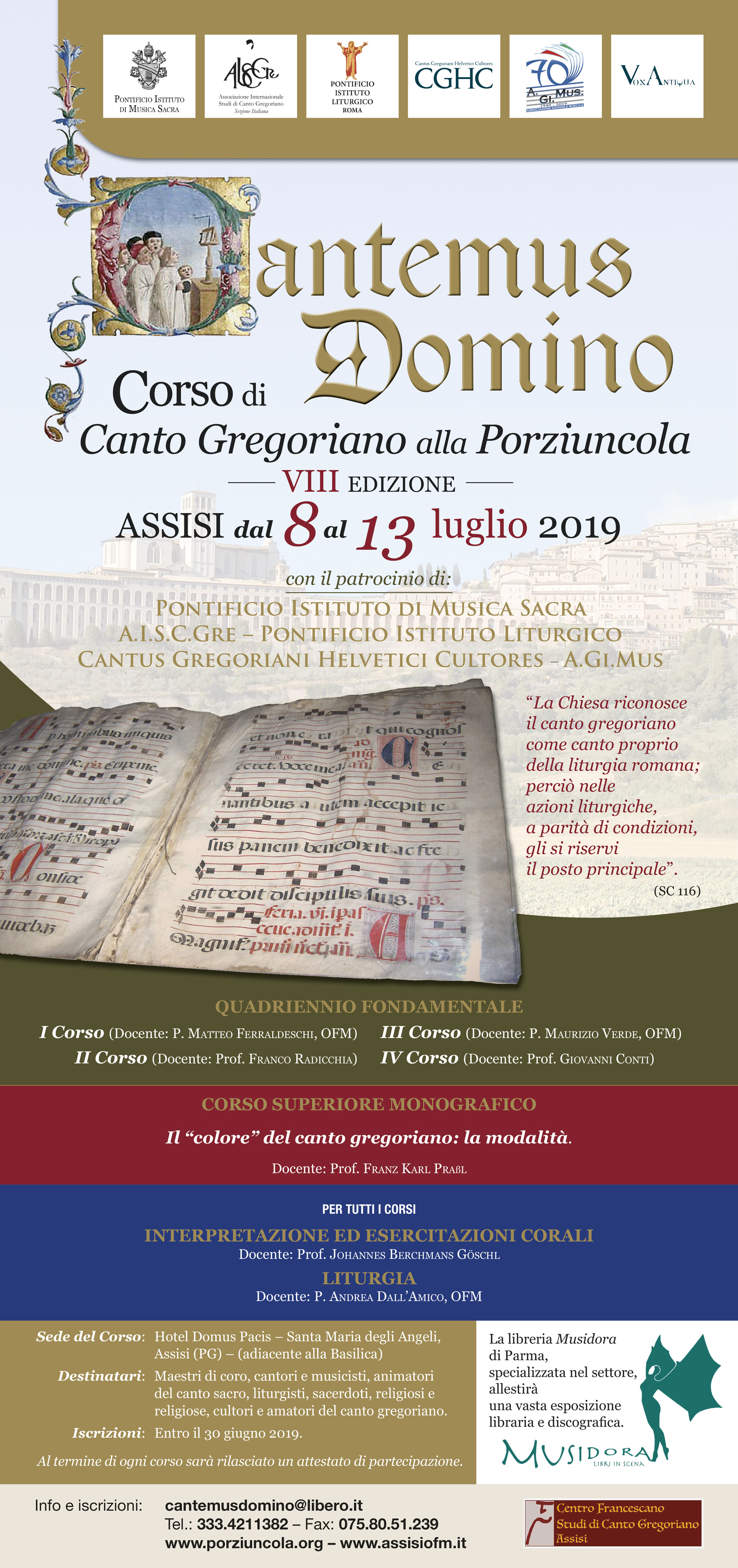 Il “Centro Francescano Studi di Canto Gregoriano – Assisi” da il via alla VIII Edizione del Corso Estivo di Canto Gregoriano Cantemus Domino, che si terrà nella settimana da lunedì 8 a sabato 13 luglio 2019. Il percorso formativo, sulla scia degli studi già iniziati da Eugène Cardine e Luigi Agostini, è articolato in un quadriennio di base e un corso monografico superiore, e gode di importanti patrocini: Pontificio Istituto di Musica Sacra, AISCGre (Ass.ne Internazionale Studi di Canto Gregoriano), Pontificio Istituto Liturgico, Cantus Gregoriani Helvetici Cultores A.Gi.Mus.