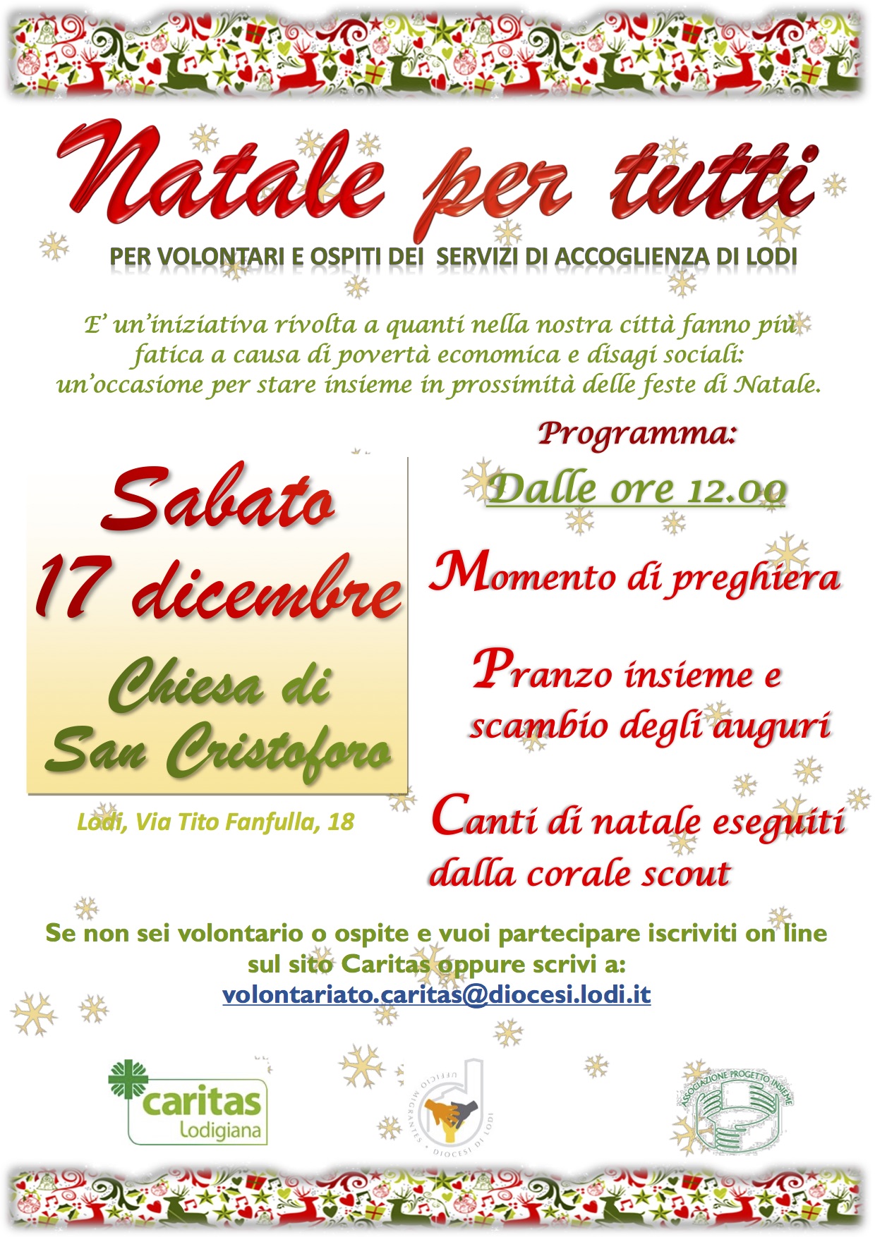 Natale per tutti è un’iniziativa degli Uffici Caritas e Migrantes della Diocesi di Lodi, in collaborazione con l’Associazione Progetto insieme, ed è rivolta a quanti nella nostra città fanno più fatica a vivere, a causa di povertà economica e disagi sociali.